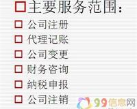 一、新公司登记注册:核准名称,特殊行业的专项审批,验资报告,公司章程,组织机构代码,税务登记,银行开户等。 二、企业变更:变更营业执照,工商年检,一般纳税人申请,垫资、增资,转让执照等。 三、专项审批:图书批发零售、卫生环保、美容美发、ICP认证、物流、道路运输、股权转让、商标注册、进出口等。 四、会计服务:代理会计记账,验资评估,建账建制,核算报税,清理乱帐等..